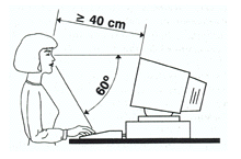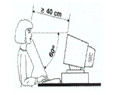 - A una altura tal que pueda ser visualizada dentro del espacio comprendido entre la línea de visión horizontal y la trazada a 60º bajo la horizontal. Así se evita posiciones forzadas del cuello. (Ver Fig.)