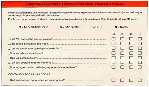 Cuestionario 1![]() Cuestionario 2![]() Sistema de puntuación y evaluación1. Obtención de índices cuantitativos de SLMediante la evaluación de la primera parte obtenemos un índice de satisfacción general y otros parciales respecto al salario, al tipo de trabajo, a los subordinados, a los directores o superiores, a la promoción y a la organización. ProcedimientoSe aplica la siguiente fórmula: i = (3M + 2B + P) /300 Donde: