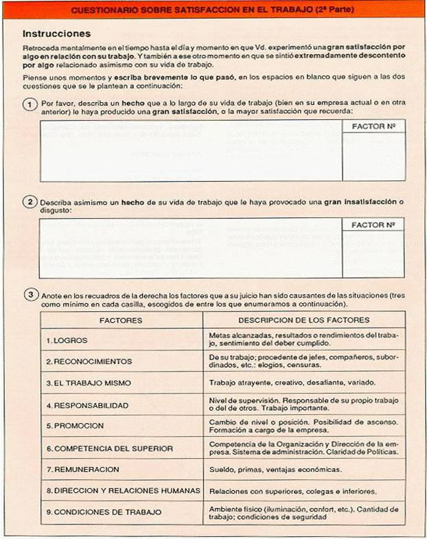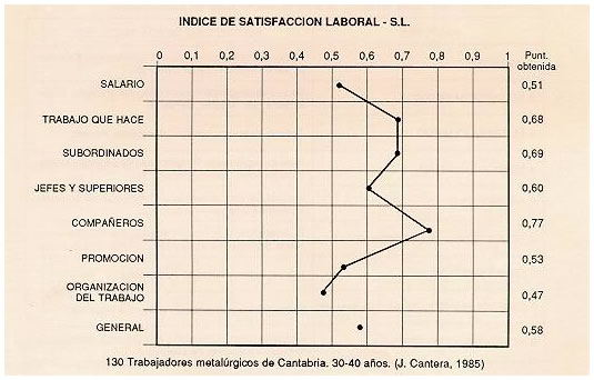 Los resultados de un grupo pueden graficarse de diversos modos. Adjuntamos uno de los posibles modelos en el que transcribimos las puntuaciones obtenidas por un grupo de 130 trabajadores de la pequeña y mediana empresa (metalúrgicos, fundamentalmente) de Cantabria. Varones. Edad, entre 30-40 y en el año 1985. 2. Análisis cualitativoSe puede realizar de varias maneras. Sugerimos utilizar el método del perfil de Herzberg que compara en un cuadro bipolar las frecuencias de los motivos de satisfacción e insatisfacción. Agrupa los primeros (satisfacción):